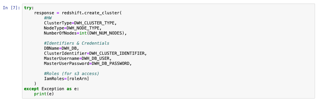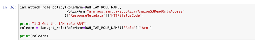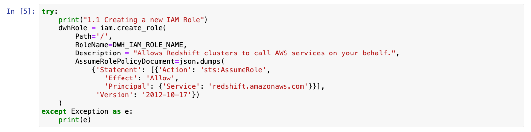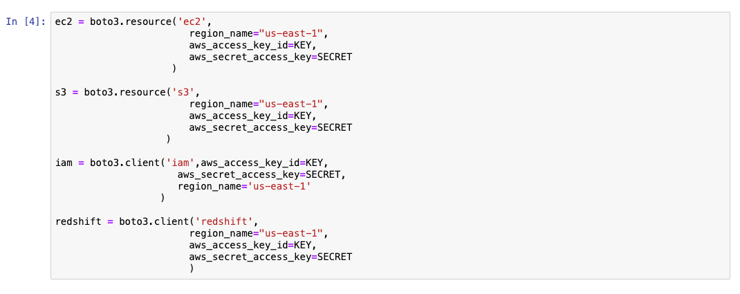 Create clients and resources for IAM, EC2, S3, and Redshift