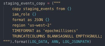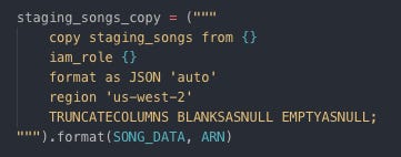 Copying raw data from AWS S3 to Bucket to staging tables created on Redshift